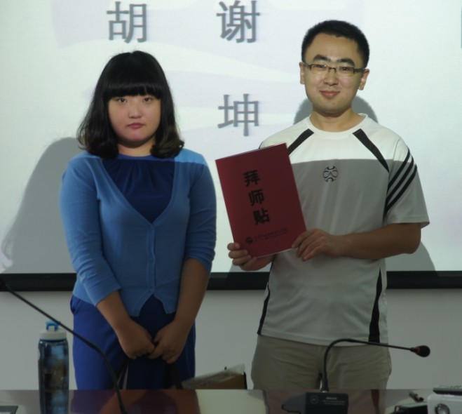 徒弟手持拜師貼與老師共同拍照留念